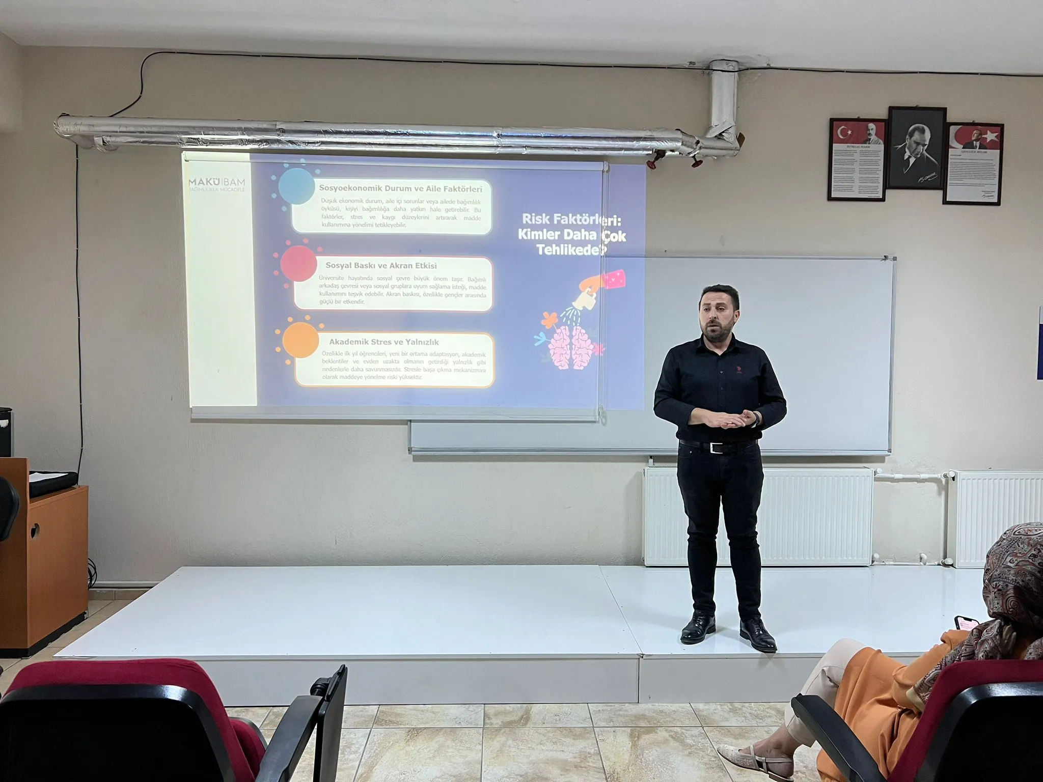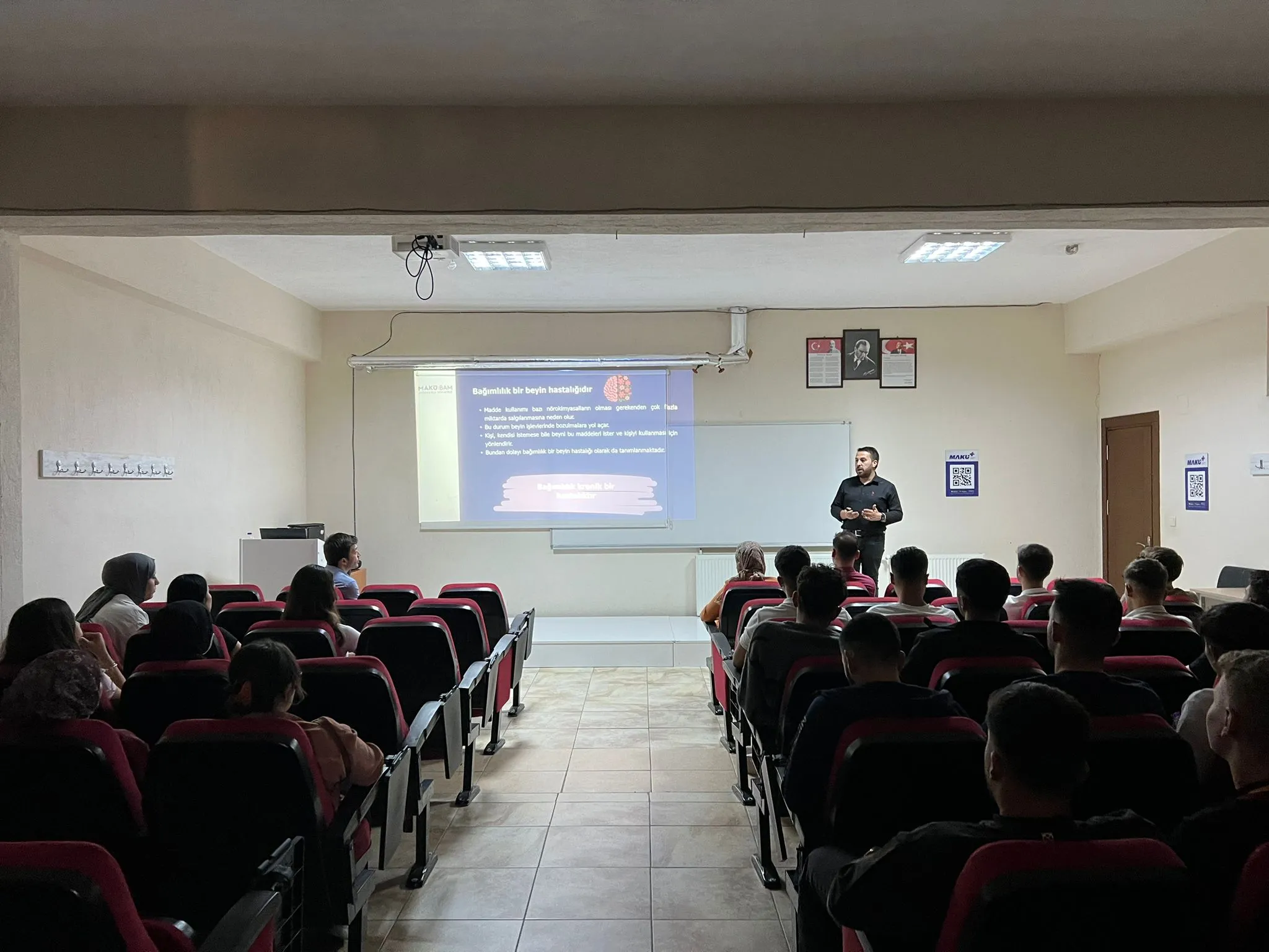 Eğitim kapsamında, üniversitemiz Bağımlılıkla Mücadele Koordinatörlüğünce hazırlanan sunum doğrultusunda bağımlılıkla mücadele konusunda farkındalık oluşturuldu. Bu çerçevede okulumuz Müdürü Öğr. Gör. Haluk AKTAY, öğrencilerimize bağımlılıkla mücadelenin önemi, bağımlılık türleri ve korunma yolları hakkında bir sunum yaptı.